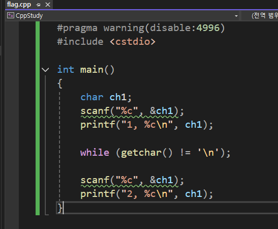 우리가 원하는 방식인 하나만 비워주는 방식을 생각한다면 그냥 getchar()라는 함수를 사용해서 하나의 문자를 그냥 소비만 시켜주는 방식이 더 좋을 수도 있다(현재 처럼 하나의 문자만 입력받고 엔터를 친다는 가정하에)