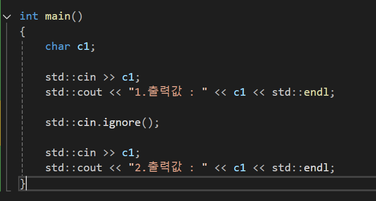 - std::cin.ignore() : C++에서 표준 입력 스트림(std::cin)의 입력 버퍼에서 문자들을 무시(버림) 할 때 사용하는 함수