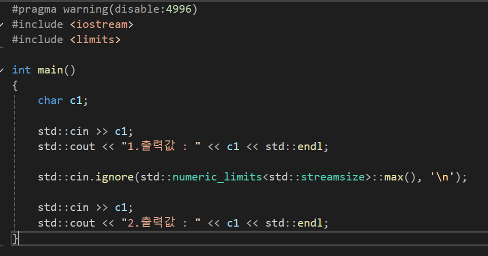 std::cin.ignore(스트림크기, 구분문자);