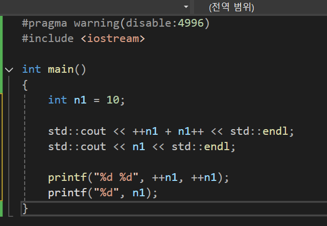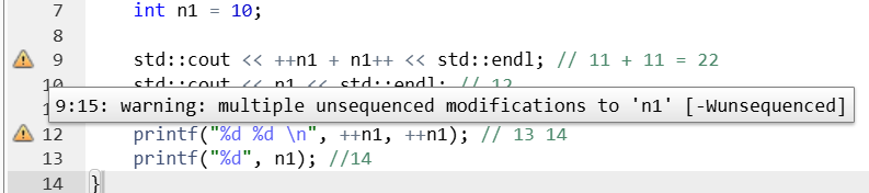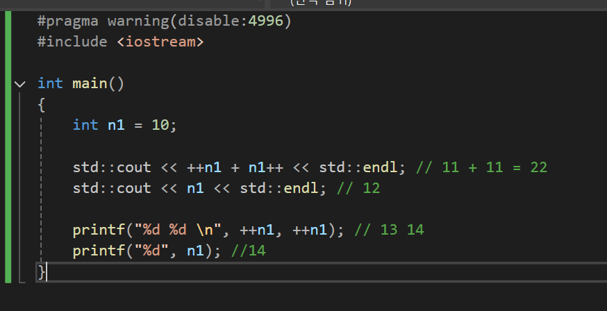 결과적으로 컴파일러는 어떤걸 먼저 수행해야 할지 보장하지 않기에 컴파일러에 따라 ++n1을 먼저하기도, n1++을 먼저 수행하기도 할 수 있다는 말이다.