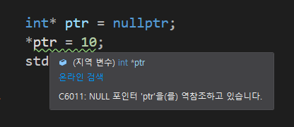 이렇게 nullptr이라는 값으로 조건을 맞춰 해당 포인터가 아무것도 가리키지 않는 상태라면 잘못된 접근을 우회하여 방지할 수 도 있게 된다.