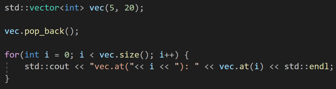 2) pop_back() : 맨 뒤 요소 제거(크기도 줄어듦)