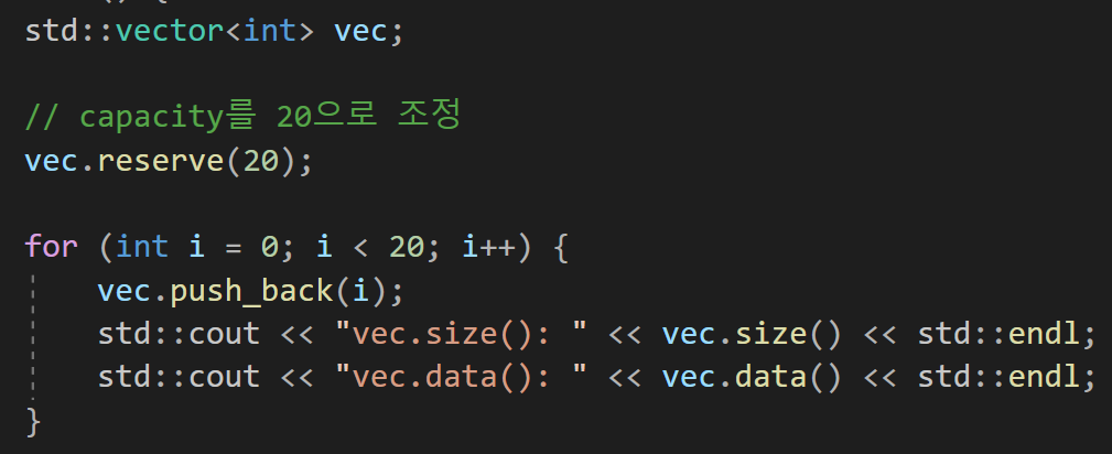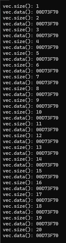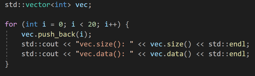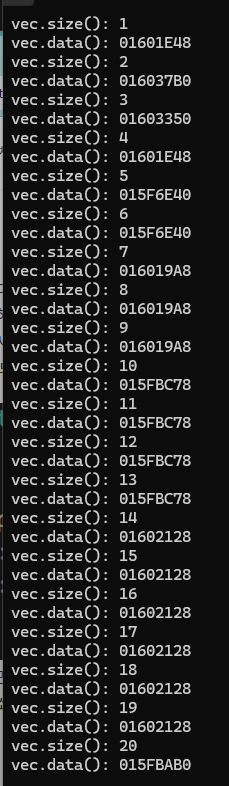 이렇게 루프문을 돌면서 크기가 커질때마다 vector의 크기(vector.size())와 해당 vector의 주소값을 확인해보면(vector.data(): vector의 첫번째 요소가 가리키는 주소값을 반환함)