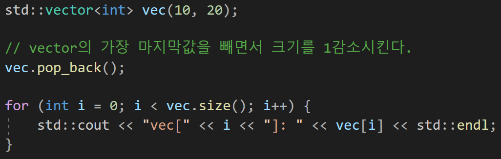 반대로 가장 마지막 값을 빼면서 vector의 크기를 줄일 수도 있는데 이 기능을 하는것은 pop_back()이라는 함수이다