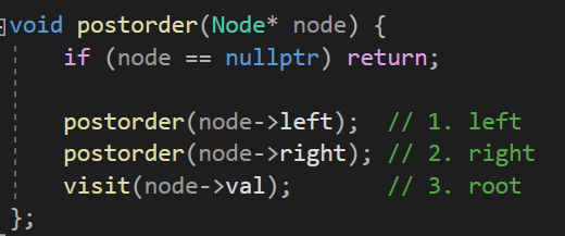 | 후위순회(Postorder Traversal) | 왼쪽 서브트리 → 오른쪽 서브트리 → 루트 | left → right → root |