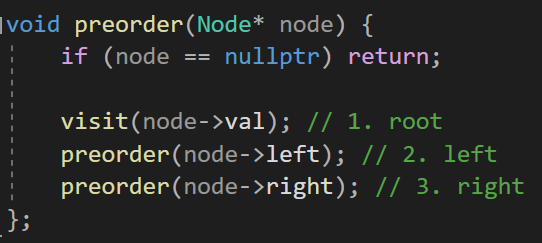 | 전위순회(Preorder Traversal) | 루트 → 왼쪽 서브트리 → 오른쪽 서브트리 | root → left → right |