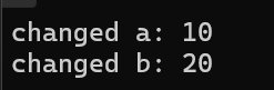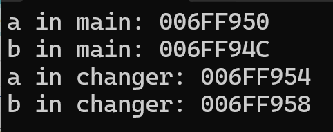 이렇게 main의 a, b와 changer의 a, b 의 주소값이 다른것을 볼 수 있고 이건 각각의 변수가 다른 위치에 존재하는 변수라는걸 확인 시켜준다.