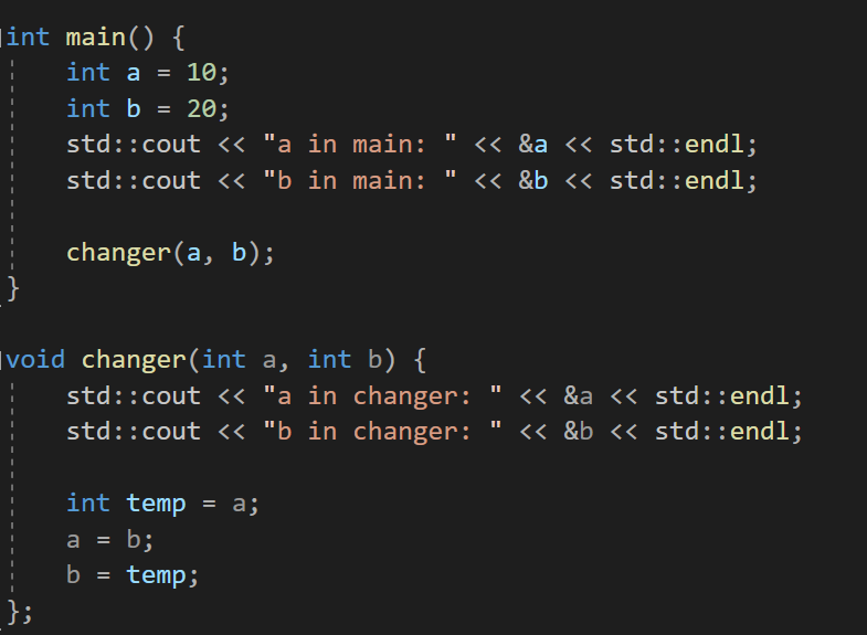 main이란 함수에서 changer를 호출할때 a와 b를 전달해줬는데 이는 사실 a, b 자체를 직접 전달한게 아니라 a와 b의 값을 전달해주는 것으로 사실상