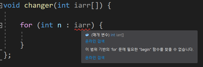 근데 iarr, int * 타입의 경우는 컴파일러가 그 값만을 보고 begin(), end() 같은 함수가 존재하는 것 확인하지 못하기 때문에 에러가 발생하게 되는 것이다.