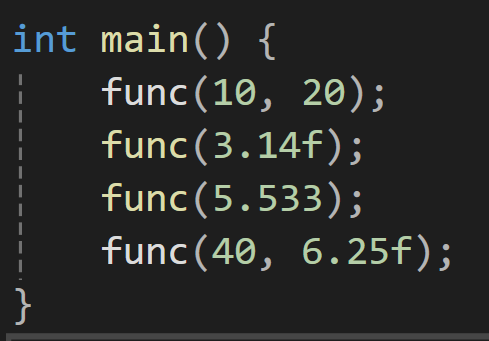 void func(int a, float b){ // 매개 변수 순서 : int - float