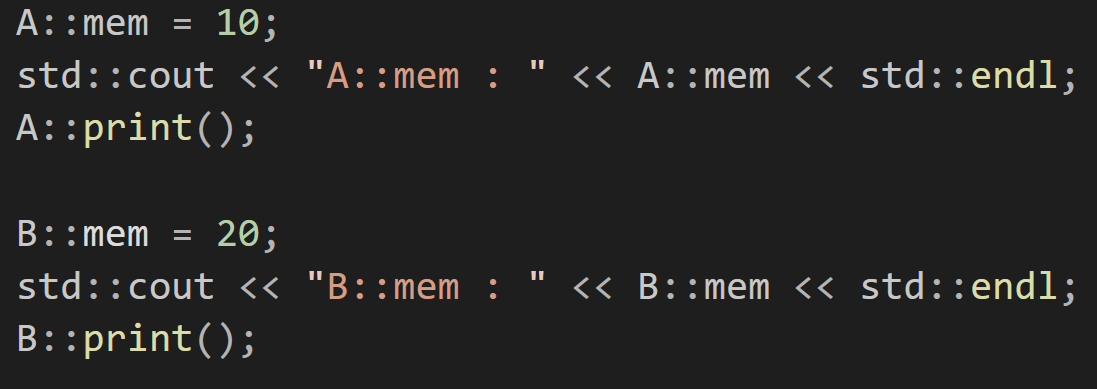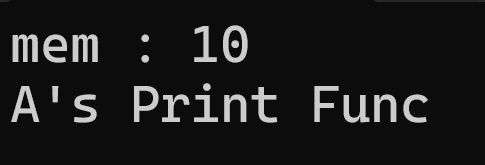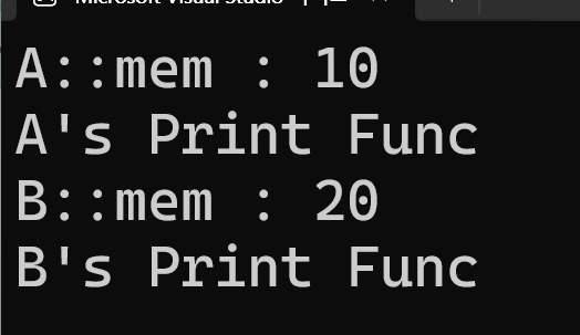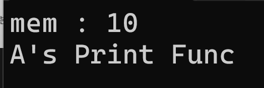 이렇게 같은 mem이라는 명칭으로 멤버 변수가 선언되어 있고 같은 print라는 명칭으로 멤버함수가 동일하게 선언되어 있는 것을 볼 수 있다.