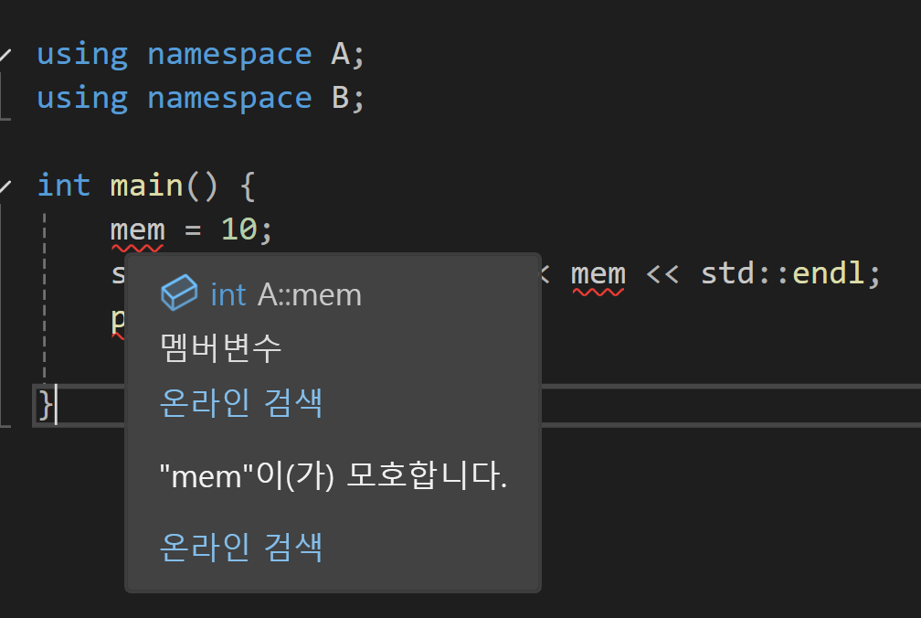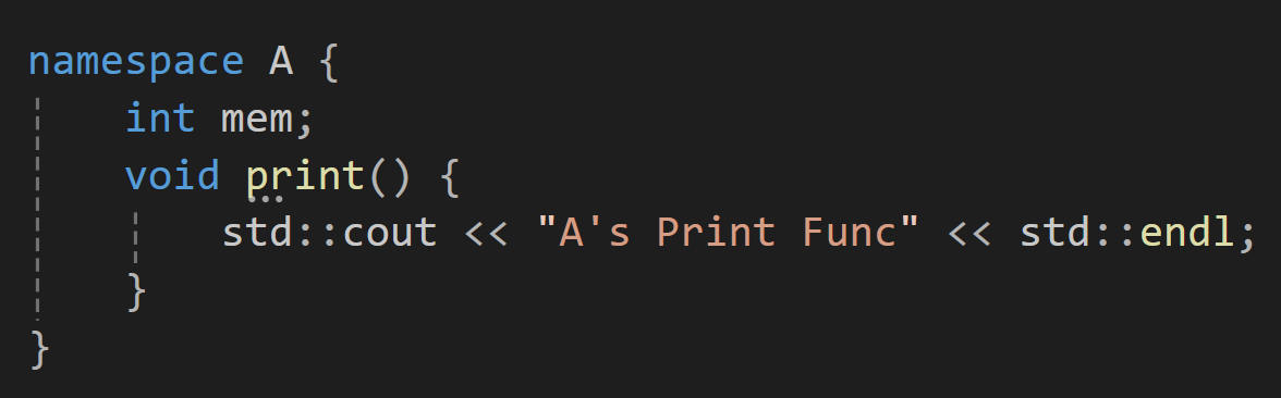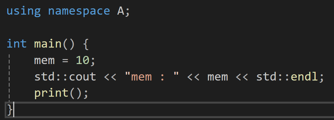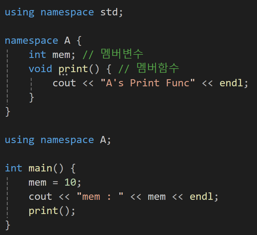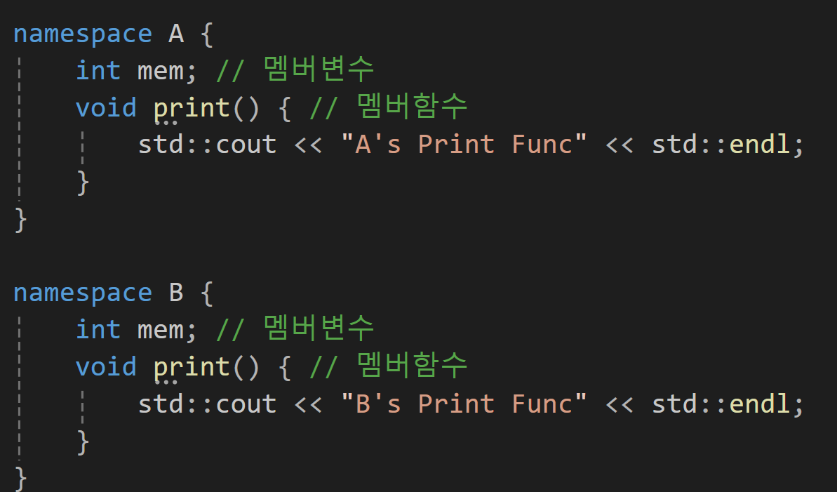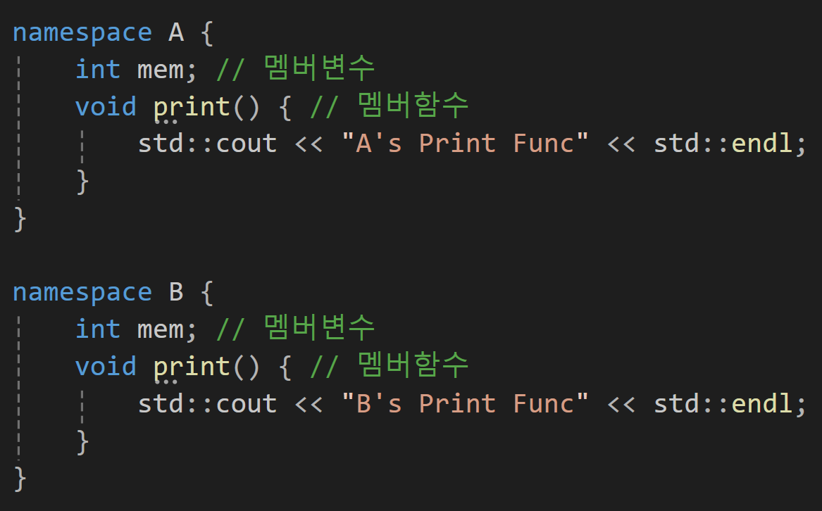 이 함수들을 만약 그냥 mem이라던게 print로 호출하려고 한다면 컴파일러의 입장에서는 어떤 mem을 불러야할지 어떤 print를 불러야 할 지 알 수 없을 것일텐데 이를 위와 같이 namespace라는 키워드를 사용한 곳에 담아두면