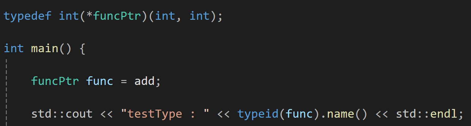 int result = funcPtr(3, 4); // 포인터로 add를 호출
