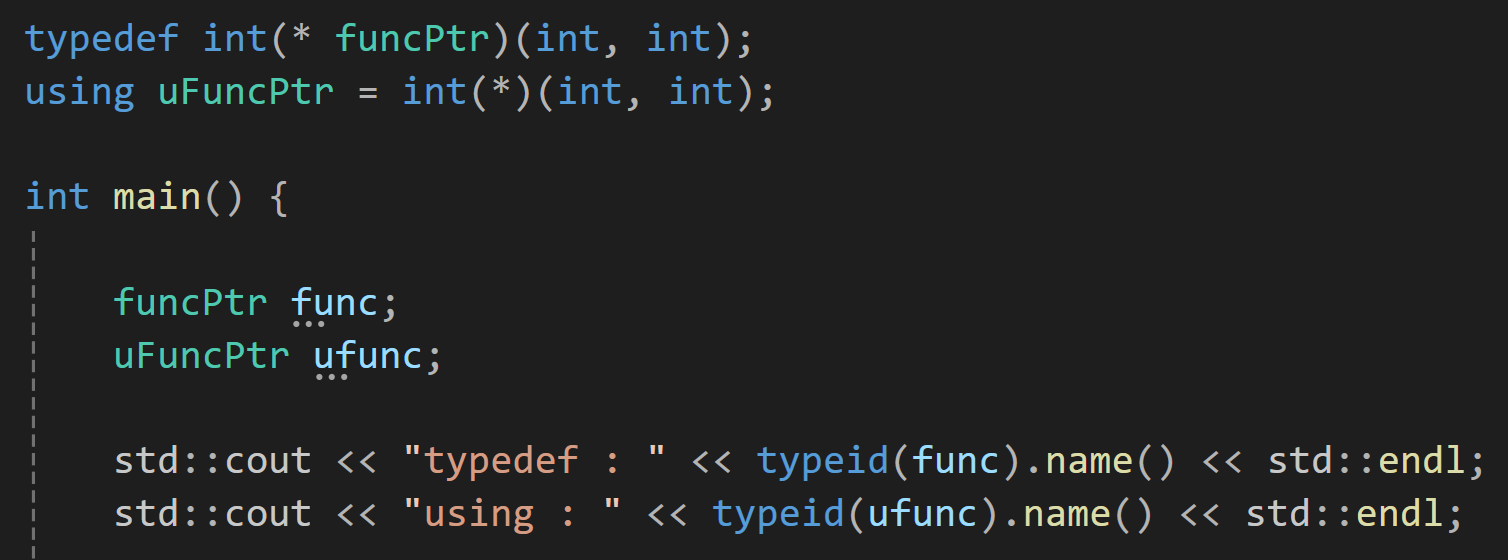 이렇게 함수 포인터도 typedef를 사용해서 만들어줄 수 있다는 것을 알아두자.