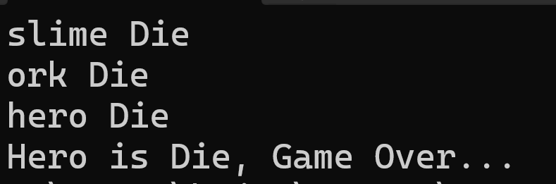 특별한건 없고 영웅이 죽었으니 게임 오버다 라는 내용을 출력해주는 함수를 만들어주자.