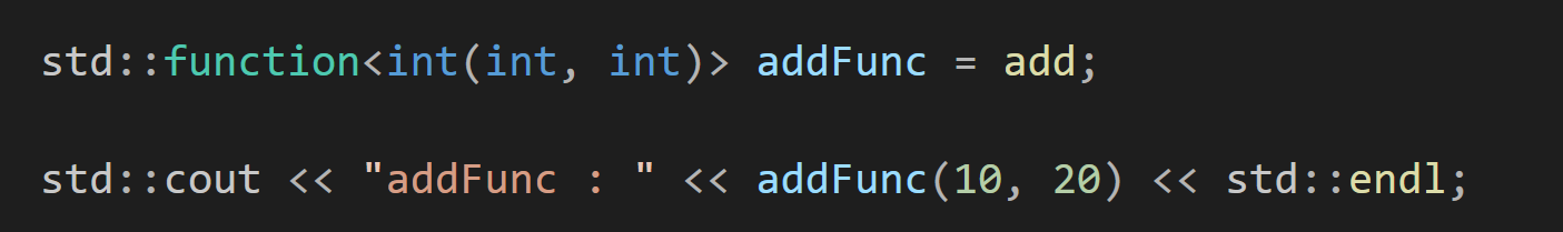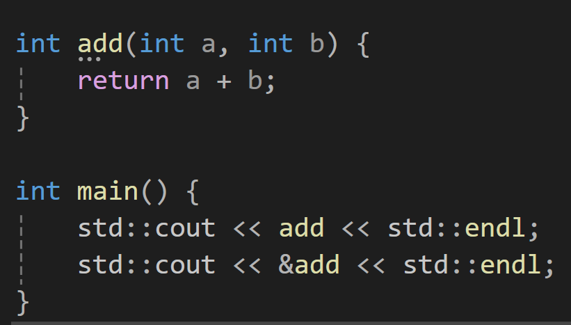 std::cout << (*add)(a, b) << std::endl; // (*add)를 하면 add가 나옴