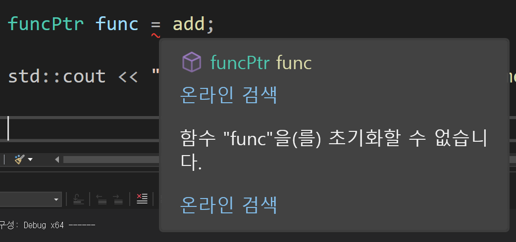 => int* ptr(int, int) = add; 이런식으로 사용하면 컴파일러는 ptr을 함수로 인식하고 있는데 add를 초기화하려고 하기에 컴파일 에러를 발생시킴