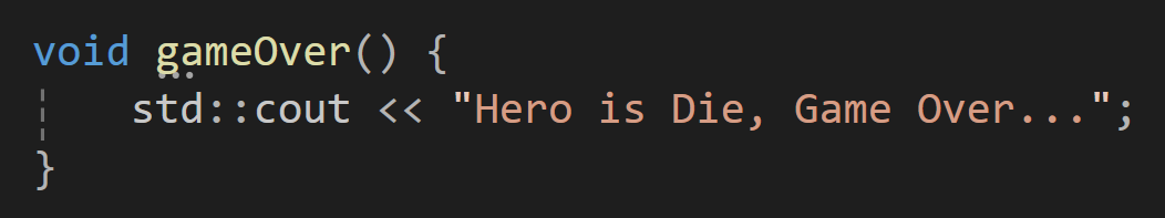 특별한건 없고 영웅이 죽었으니 게임 오버다 라는 내용을 출력해주는 함수를 만들어주자.