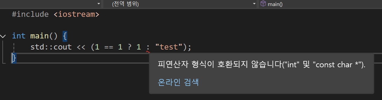 이렇게 피연산자의 형식이 int 와 const char* 타입이 호환되지 않기에 이렇게 사용이 불가능하다고 나온다.