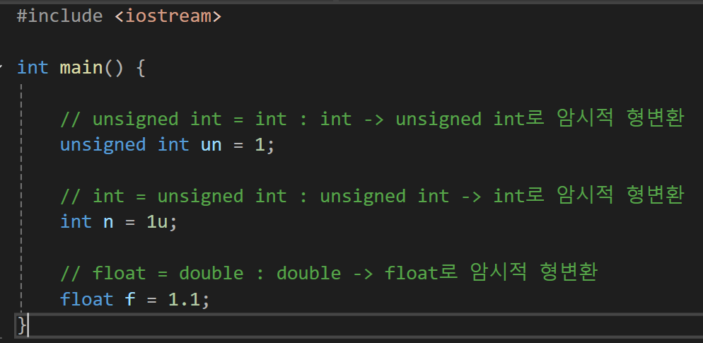 암시적 형변환(Implicit Conversion)의 경우는 컴파일러가 자동으로 해주는 형변환으로 따로 형변환을 명시하지 않아도 컴파일러가 변환해준다.