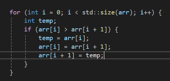 첫번째 요소와 두번째 요소를 비교해준 후에 큰 값을 뒤로 이동시키는데 잠깐 이동시킬 값을 담아둘 temp를 먼저 선언해준 다음에 조건 절을 추가하자