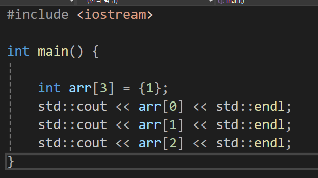 int arr[3]{1} // = 연산자 없이 초기화 => 할당되지 않은 값 0으로 초기화