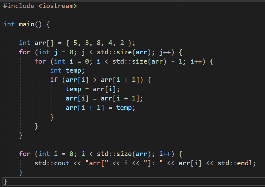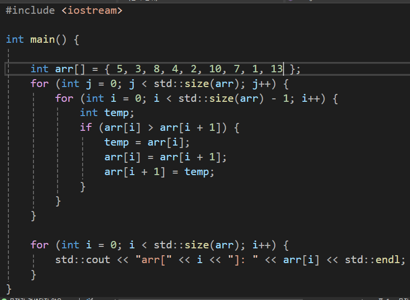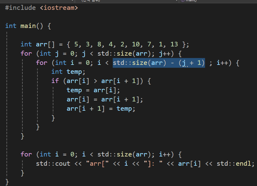 그래서 내부 for 문의 경우는 배열의 크기 - (돌은 회차 + 1) 의 크기만큼 돌리면 된다는 것을 알 수 있다