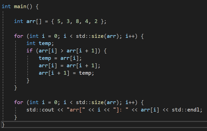 그래서 내부 for 문의 경우는 배열의 크기 - (돌은 회차 + 1) 의 크기만큼 돌리면 된다는 것을 알 수 있다