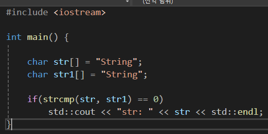 함수의 원형은 위와 같이 생겼고 문자열 두개를 넣음으로써 0이 나오면 문자열이 서로 같음을 나타내고, 0보다 작은 값이 나올 경우 str1이 str2보다 작음을 나타내고(사전 순으로 앞인 값), 0보다 큰 경우엔 str1이 str2보다 큼을 나타낸다(사전순으로 뒤인 값)