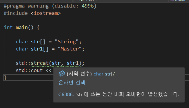 이 경우에도 붙여지는 문자열에는 충분한 크기를 가지고 있어야만 한다.