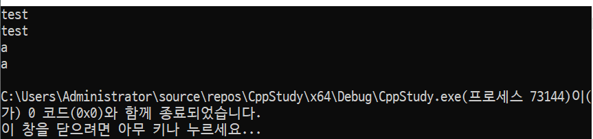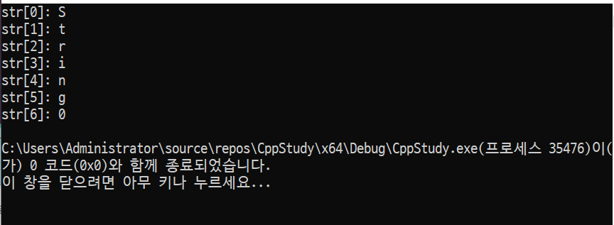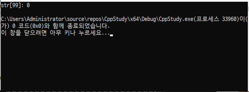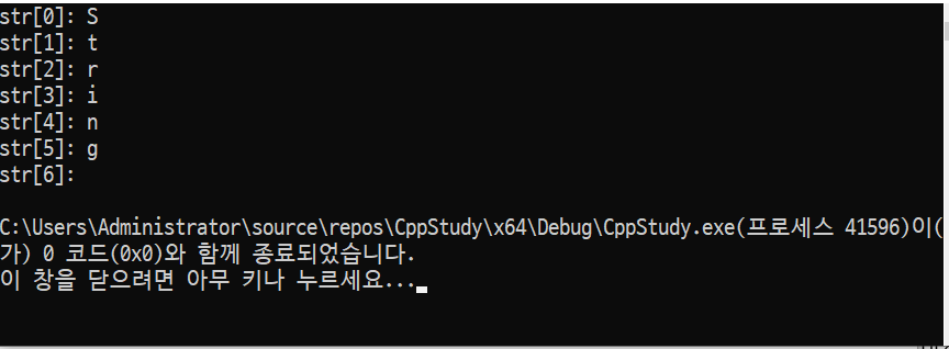 마지막에 빈것은 널문자라고 해서 문자열의 종료 지점을 알려주는 문자로 확인하기 위해서 타입을 int로 바꿔보면