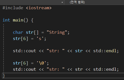 끝에 붙이는 문자열도 널 문자(\0)를 포함해서 처리된다.