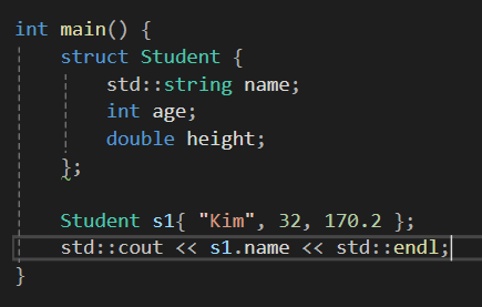 Student s1{ "Kim", 32, 170.2 };