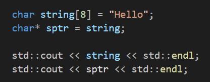 조금 다른 점은 배열의 경우는 std::cout에 넣었을 경우 주소값을 반환했으나 문자열의 경우는 값을 반환한다는 점이다.