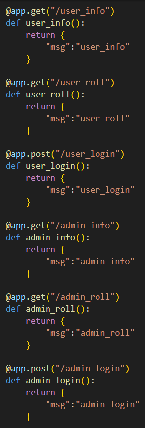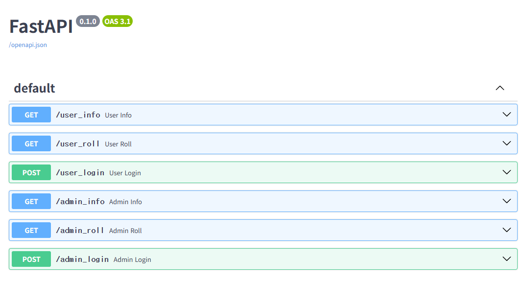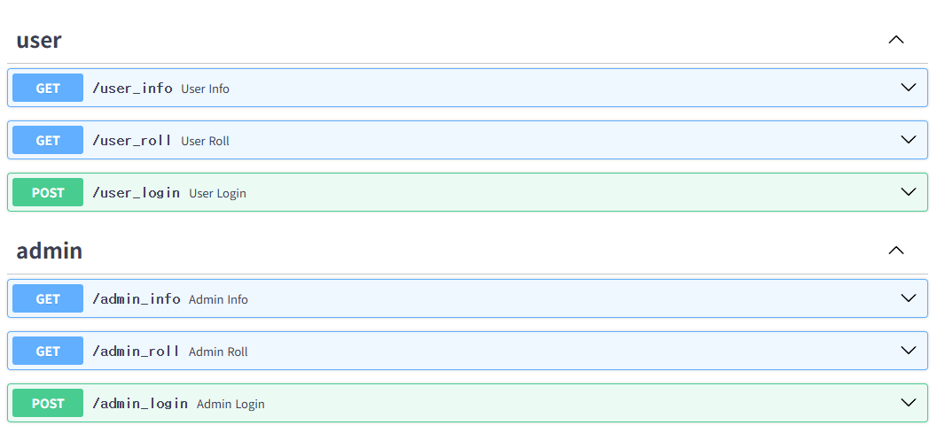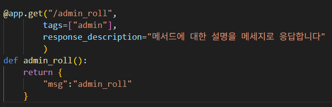 여기서 라우팅 데코레이터에 tags로 str로 된 단일 배열로 user에 대한건 "user"로 admin에 대한건 "admin"으로 설정해주면