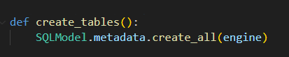 • .create_all(engine) : 이 메더스가 실제 작업을 수행하는 부분으로 인자로 전달한 engine을 통해서 데이터베이스에 연결하고 SQLModel.metadata에 저장된 모든 테이블 설계 정보(우리가 생성한 SQLModel을 상속한 Model)를 확인하고 설계도에 따라서 CREATE TABLE SQL 명령을 실행해서 물리적인 테이블을 생성한다.