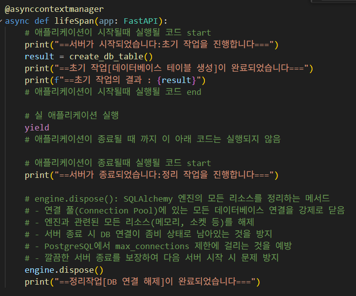 lifespan은 FastAPI 애플리케이션의 시작과 종료 시점에 특정 코드를 실행하도록 돕는 기능이다.