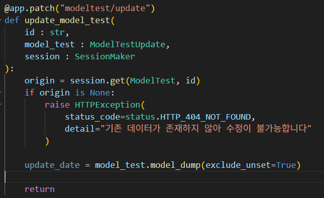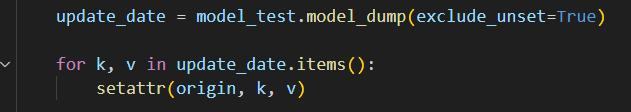 그리고 model_test로 받은 모델 데이터를 dict로 전환하기 위해서 model_dump로 복사하는데 이때 exclude_unset을 True로 하면 사용자가 전달한 데이터 필드만 dict의 key-value의 형태로 유지 하도록 만들어준다.