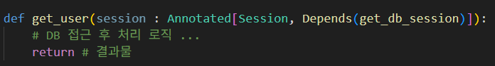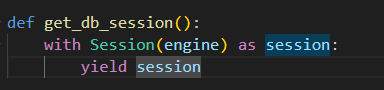 추후 해당 함수는 Depends의 인자로 전달되어 DB 세션을 엔드포인트에게 의존성 주입으로 전달하게 될것이고 해당 엔드포인트 메서드가 종료된다면 해당 세션의 yield가 끝나게 되면서 자동으로 sesison을 close할 게 될 것 이다.