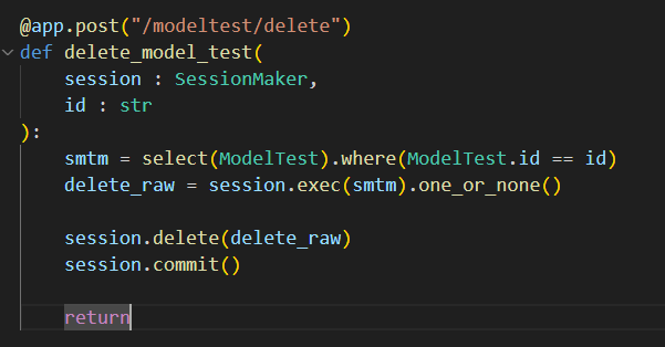 이제 메서드를 만들어서 테이블을 조작할 수 있도록 할것인데 기본적으로 각각의 메서드에서는 DB에 접근하기 위해서 엔진에 세션을 요청하고 이를 세션 객체로 전달해서 메서드가 DB작업을 진행한 다음에 완료되면 메서드가 종료되고 세션을 끊는 형태로 구성된다