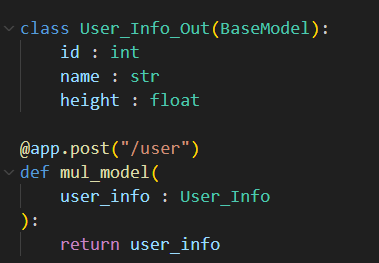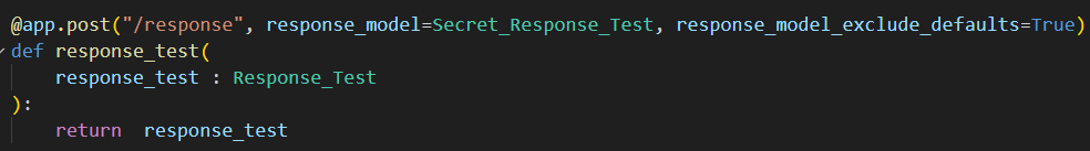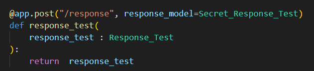 Fast API의 라우트 데코레이터(@app.post("/mian") 이 부분)에는 response_model이라는 것이 있는데 이는 스키마를 고정하고 Swagger UI에 문서화로 설정해서 클라이언트가 응답의 형태를 예측할 수 있도록 해주고, 런타임 시점에 핸들러가 타입을 변경해서 반환을 해도 지정한 모델로 검증 및 변환해서 반환하고 모델에 작성되지 않은 필드는 자동으로 제거 해줌으로써 응답을 원하는대로 제한해서 전달할 수 있게 된다.
