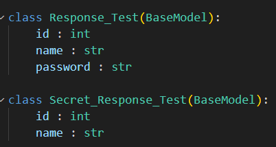 이럴 때 위 처럼 응답하지 않고 싶은 멤버를 제외한 새로운 모델을 생성하고 이를 response_model의 값으로 넣어주면