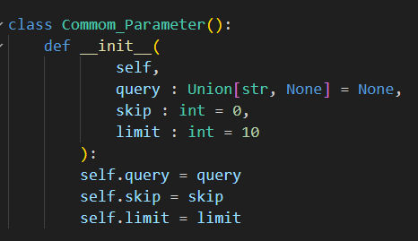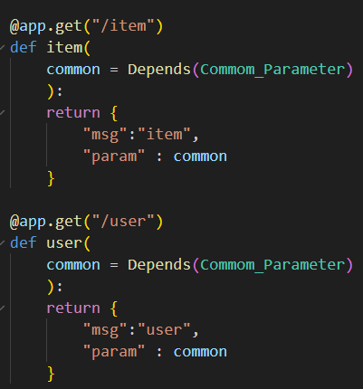 이러면 다수의 메서드에서 공통적으로 사용되는 매개변수들이 각각의 메서드에 의존적이지 않고 common_parameter에 의해 외부에서 주입되기 때문에 common_parameter를 변경하면 다수의 메서드들이 같이 변경되게 되고 이렇게 외부에서 주입하는 형태인 DI를 Fast API는 이런식으로 구현해뒀다.