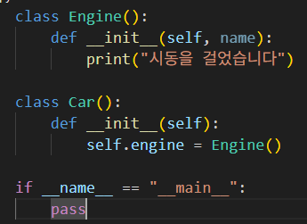 이렇게 Car에서 engine을 받기 위해서 Engine()이라는 클래스의 인스턴스를 클래스의 내부에서 생성하게 된다.