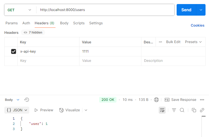 이제 포스트맨을 사용해서 Header에 x-api-key에 1111을 넣어주고 get요청으로 users에 보내보자