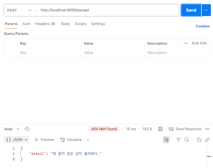 먼저 FastAPI에서는 이 Exception을 처리하기 위해서 HTTPException이라는 모듈을 제공한다.