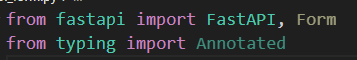 먼저 Form은 fastapi 내부에 존재하며 요청을 받았을때 어디서 값을 읽어야할지 지정해줘야하기 때문에 typing에서 Annotated를 추가해줘야 한다.