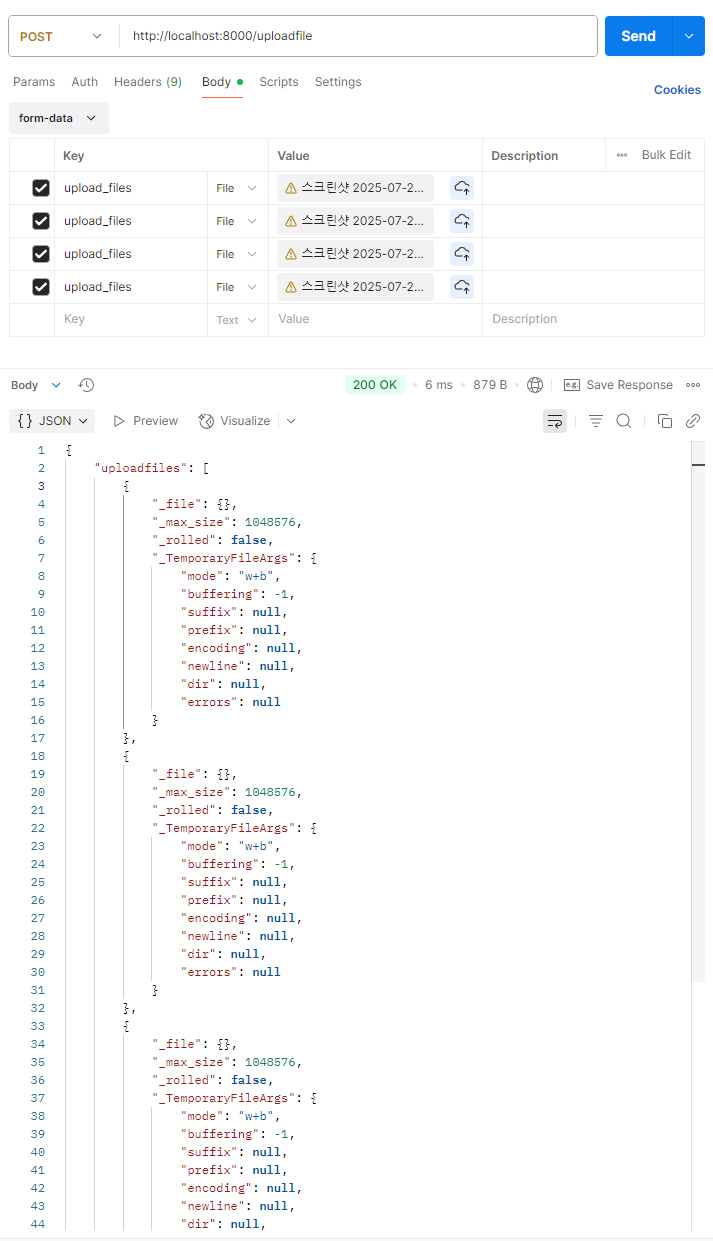 각 File과 UploadFile로 확인해보자면 먼저 File의 경우는 리스트로 타입을 넣어주고 데이터만 for-in으로 list로 뽑아주면 된다.