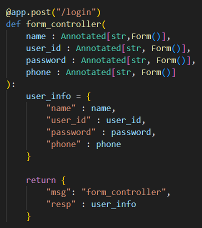 먼저 Form은 fastapi 내부에 존재하며 요청을 받았을때 어디서 값을 읽어야할지 지정해줘야하기 때문에 typing에서 Annotated를 추가해줘야 한다.