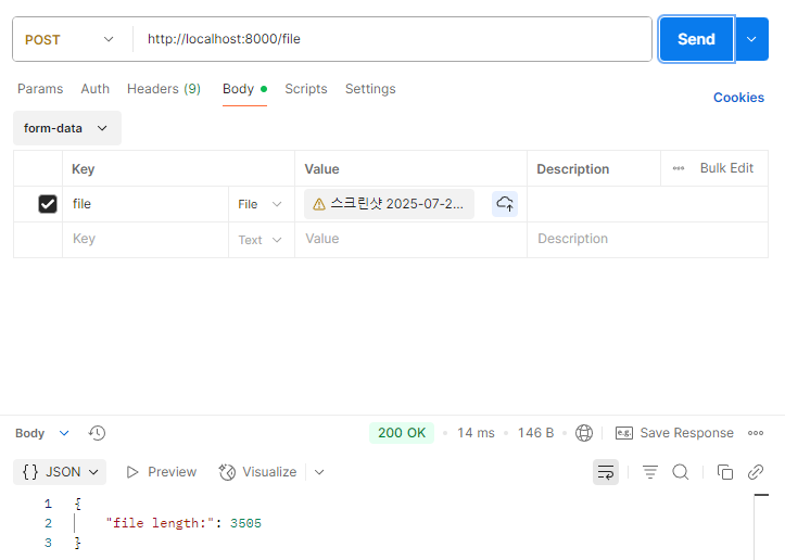 이제 파라미터에 file이란 이름으로 bytes타입으로 데이터를 받는데 File()을 넣어서 Multipart/form-data에서 file을 읽어오라고 설정해주자.